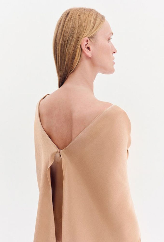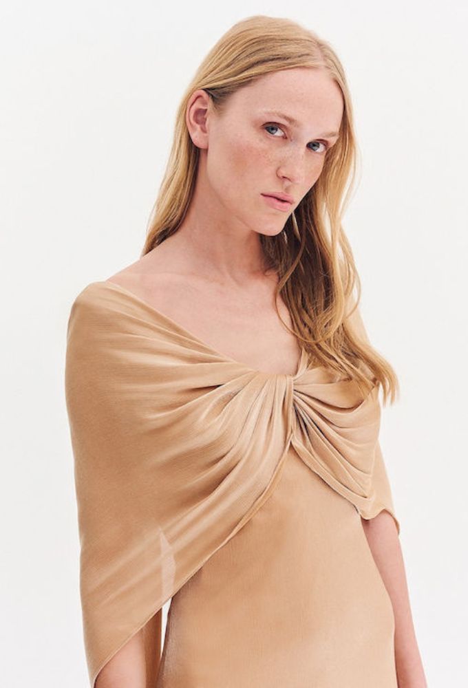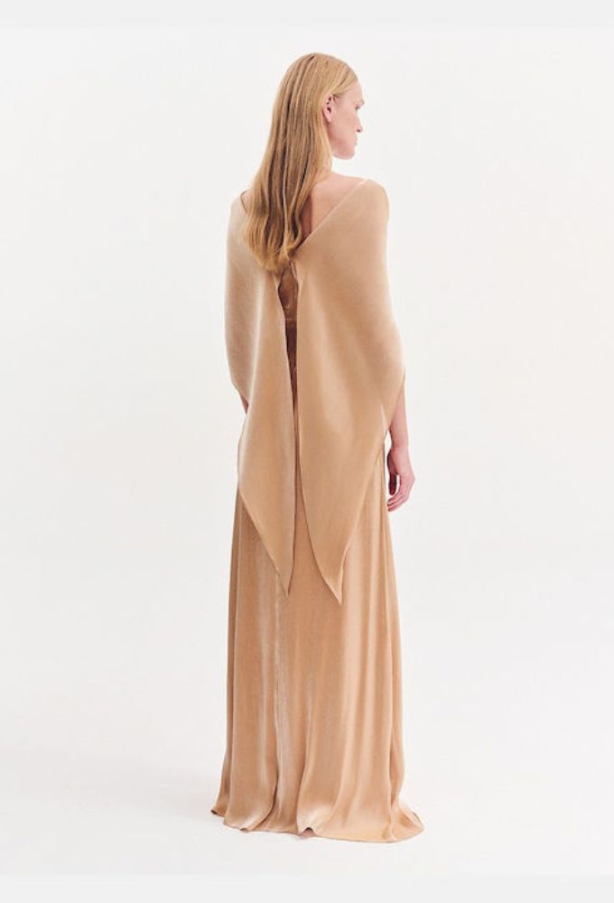 Φόρεμα μουσελίνα αμπιγιέ maxi. Ντεκολτέ “V” σε μπούστο και πλάτη. Έξτρα ύφασμα αέρινο μανίκι.